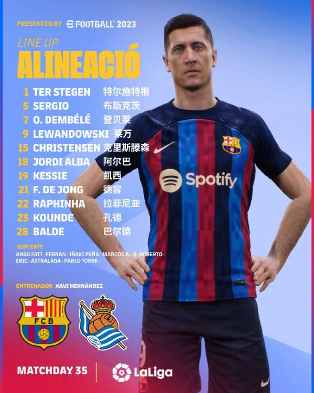 前锋:7-登贝莱(86' 32-托雷),9-莱万多夫斯基,22-拉菲尼亚(63' 10-法蒂)